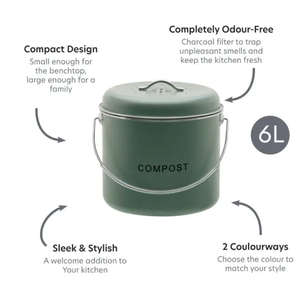 – This stylish bin makes composting effortless and odour-free, thanks to the charcoal filter that traps smells inside, keeping your kitchen fresh.