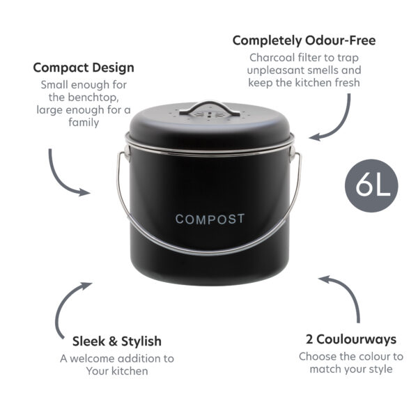 – This stylish bin makes composting effortless and odour-free, thanks to the charcoal filter that traps smells inside, keeping your kitchen fresh.